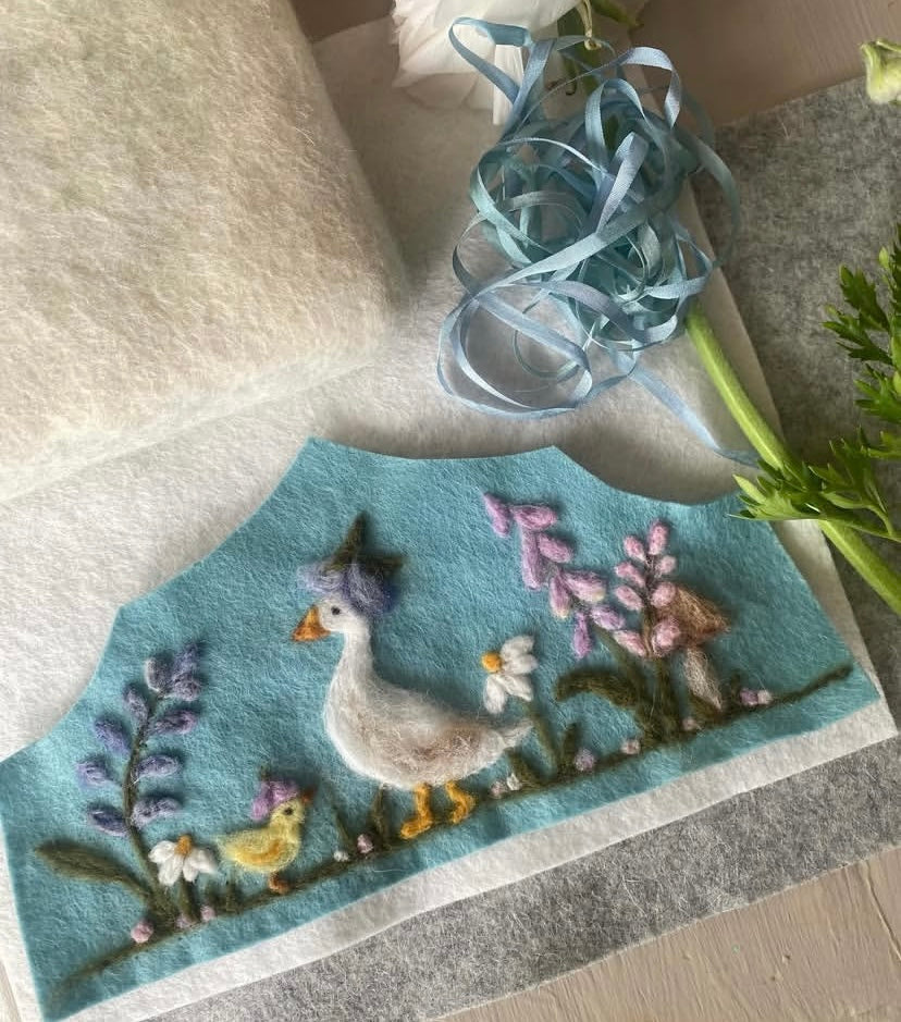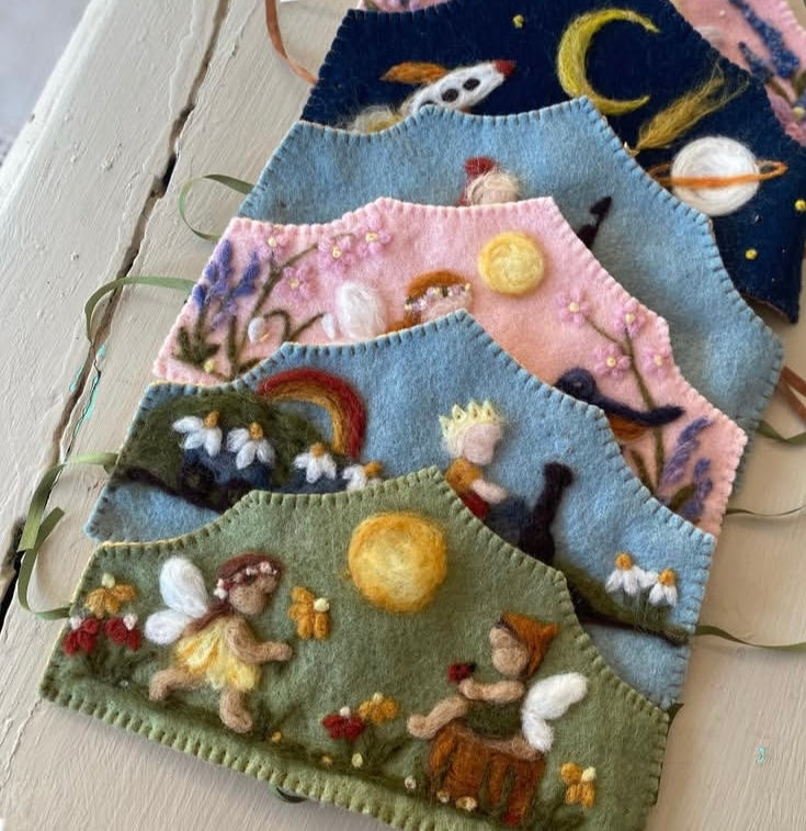 Needle felted and hand stitched , fastened at the back with elastic and silk ribbons.