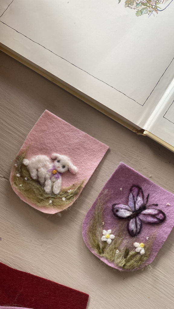 Wool felt needle felted with coloured roving and finished with cotton bias binding