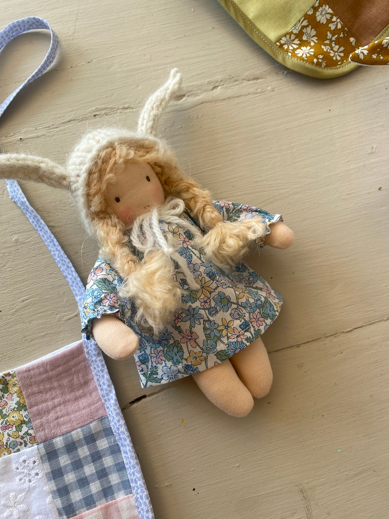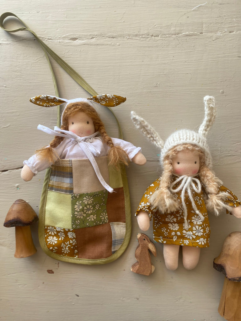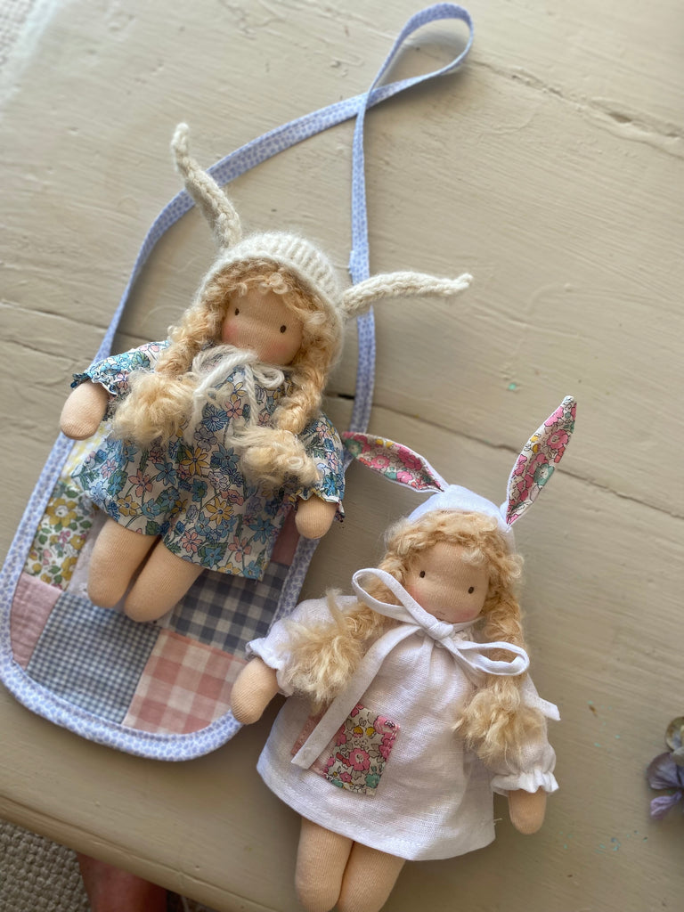 Filled with NZ sheep’s wool, the hair is mohair and the body made with cotton knit. A sweet muslin dress and hand knitted merino bunny bonnet that can be removed