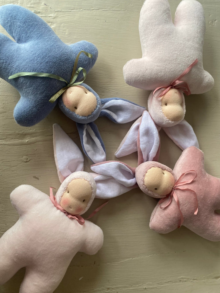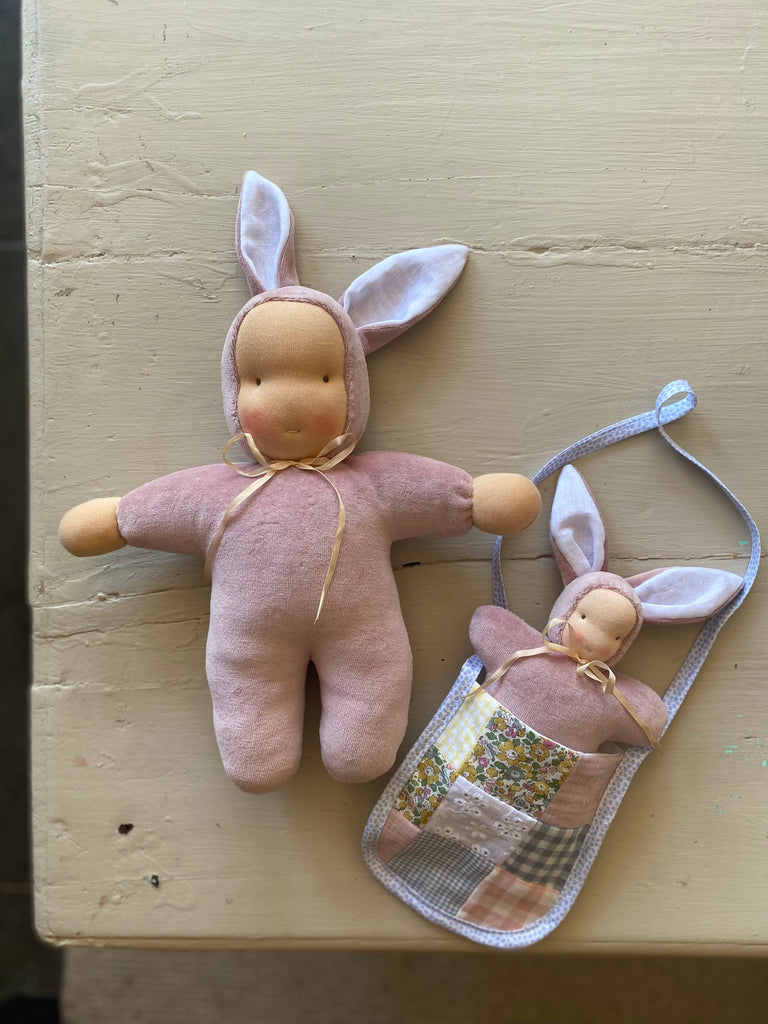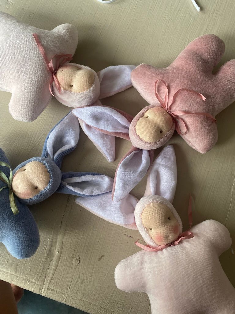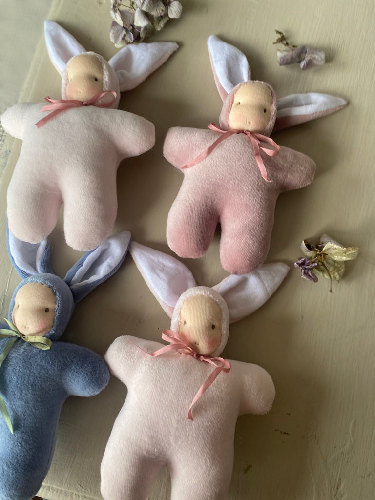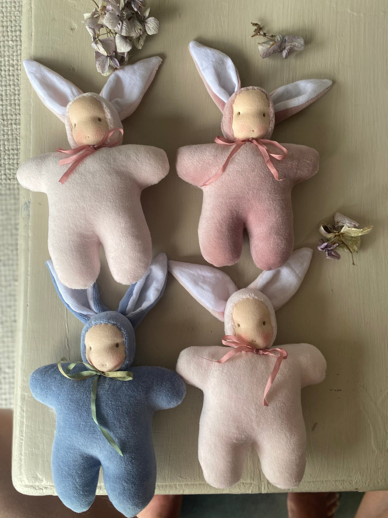 The sweetest Woodland friends with a Waldorf inspired face. Intentionally left simple to spark imagination.Handmade in NZ with all natural fibres, linen lined ears, NZ sheep’s wool stuffing, velour body