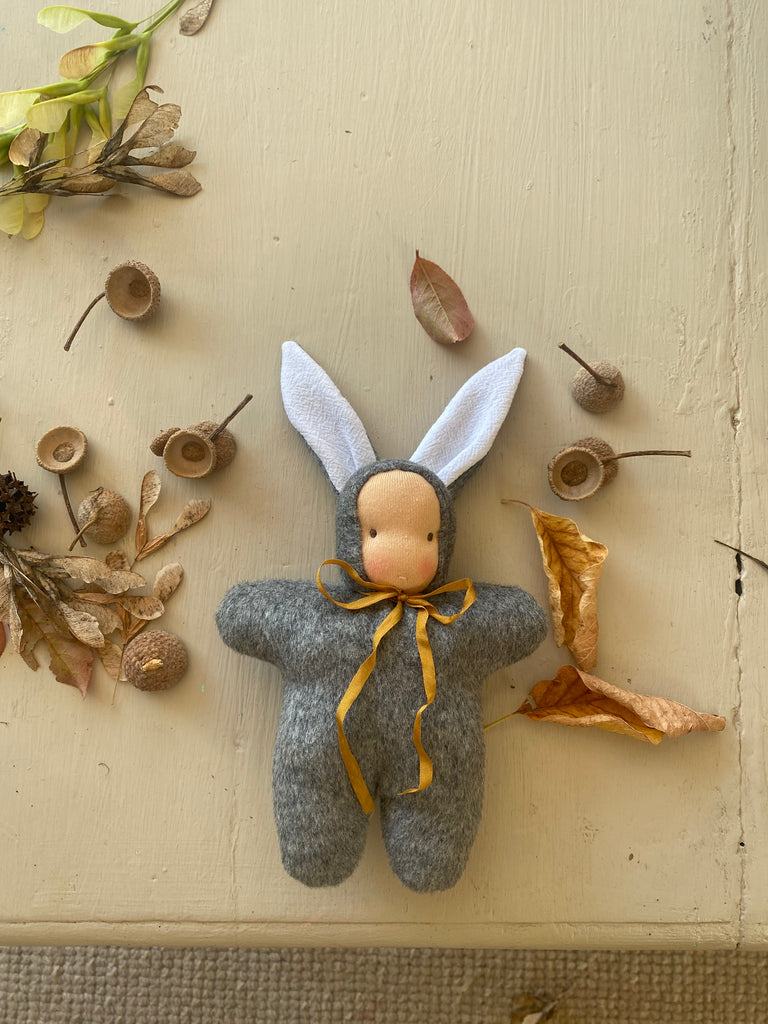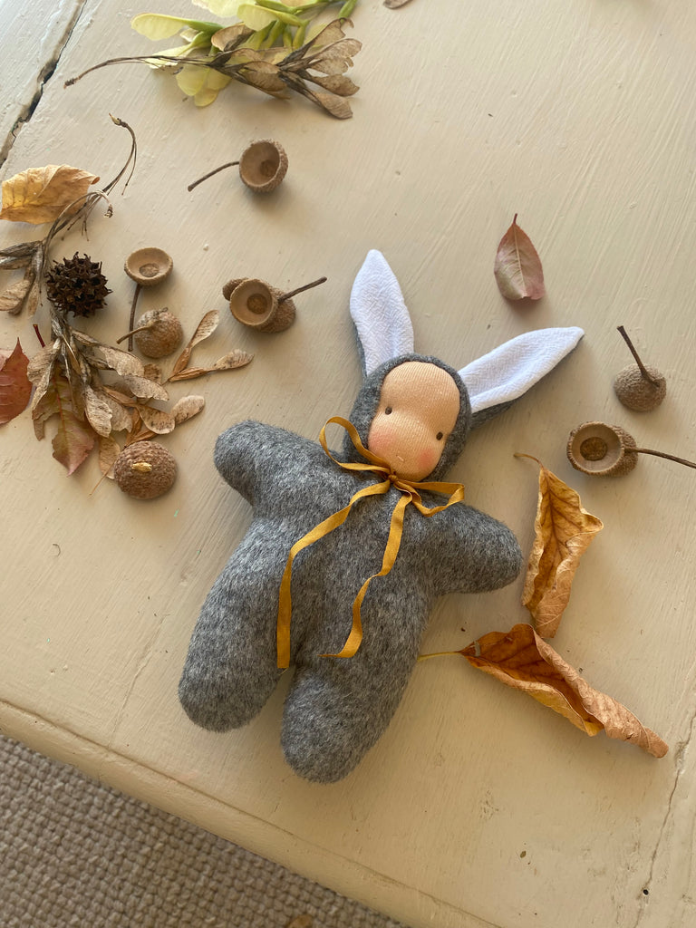 The sweetest Woodland friends with a Waldorf inspired face. Intentionally left simple to spark imagination.Handmade in NZ with all natural fibres, linen lined ears, NZ sheep’s wool stuffing, velour body